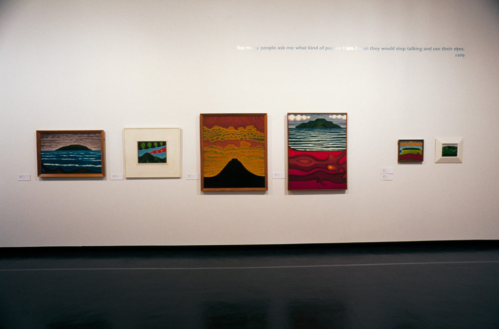 As his 1965 artist statement reveals, Illingworth adopted the role of an outsider, an individual who rejected the demands of middle-class society in the pursuit of ‘the good, the true and the beautiful.’ His canvases are a product of the 1960s and 1970s counterculture—they embody changing attitudes to the environment, gender relations, and morality. They are often unashamedly sexual and shocked some members of the public when they were first exhibited. Indeed the police received complaints of obscenity against As Adam and Eve when the painting was first exhibited in 1965 and then again in the 1970s. He knew these complainants well, and even satirised them in his ‘Piss-Quick’ figures—symbols of well dressed, middle-class Pākehā mediocrity living in their ticky-tacky suburban boxes (and sometimes shown visiting art galleries), alienated from the natural world and their own desires.