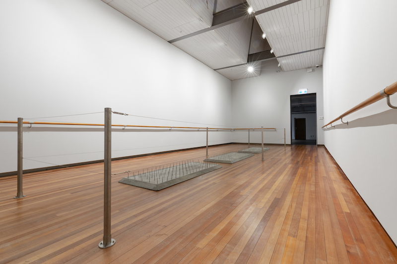 In Dayle Palfreyman’s sculpture, natural and industrial materials are combined in ways that both seduce and repel. One work consists of concrete beds of stainless steel needles sitting within a self-regulated zone. In the other, a beeswax-encrusted wooden handrail demarcates the edges of the gallery and gallery experience. The two installations focus on the relationship between the body, the object, and the environment they inhabit—how and where one can meet the other, and the historically or culturally defined terms of this exchange. Both push at the limits of our psychological encounter with objects, spaces, and histories, and their encounter with us.