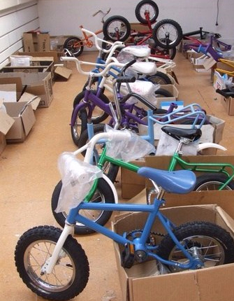 Eady’s combination of dump-salvaged bicycles, tricycles, and scooters occupy and take over exhibition space. Some lean against walls, others are haphazardly strewn across the floor. Eady clutters gallery spaces with what essentially remains sculptural form, presenting objects to be encountered rather than, or as well as, an invitation to participate. Audience participation is invited, but is not necessary to activate the meanings and potential of this project. These possibilities are firstly built into the making of these objects, which in conventional sculptural terms, is based around the transformation of material into new form. Call the bicycles found objects if you must, but what matters and ultimately determines the viewer’s engagement with the project is Eady’s workmanship and the labour-intensive process of making that transforms trash into sculptural object.