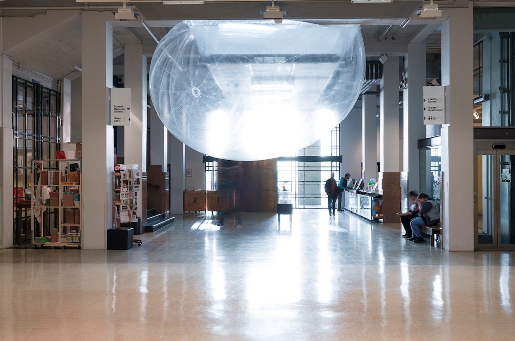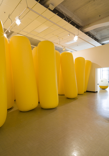 The show includes sculpture, installation, painting, video, and performance. The work reaches from Oh’s days as a student at Auckland’s Elam School of Fine Arts in the early 2000s to new works commissioned especially for the show. All the work reveals Oh’s improvisational approach towards forms, materials, and the spaces and situations into which he inserts his work. One of his large inflatable sculptures is shoved between and swallows two columns in the Gallery, another floats in the void between the ground and first floors. New installations, Periphery and Sphere Square, are environments to be walked through and clamoured over, to be experienced from the inside out.