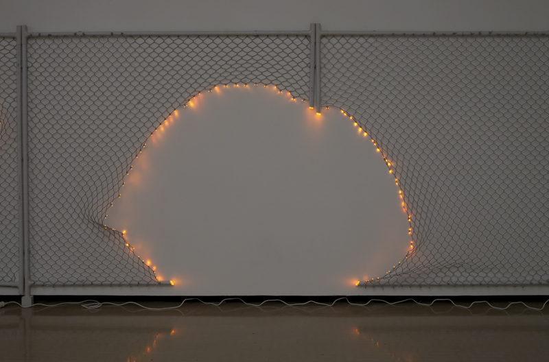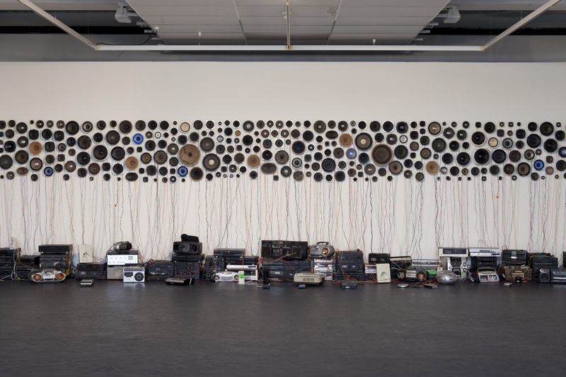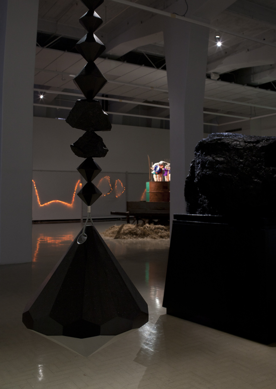 Don Driver’s Ritual (1982)—a maniacal, procession-like assemblage of hybrid human/doll/goat figures—is the oldest work in the exhibition. This makeshift altar is presented as a harbinger of this contemporary sculptural mode. It sits between Eddie Clemens’s glowing fences woven from electrical wire and conduit piping lifted from Terminator II, and Bekah Carran’s preternatural rock and crystal memorial to contemporary eco-anxieties. Ritual’s rhythmic drumbeat is one of many works that explore the sculptural potential of sound. Alex MacKinnon’s atonal soundscape is created by an accumulated mass of salvaged speakers, speaker wire, and audio equipment. The sound of a sculpture being made and unmade, materialising and dematerialising, is performed by Clinton Watkins and Trenton Garratt across two sites via radio transmission.